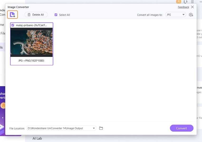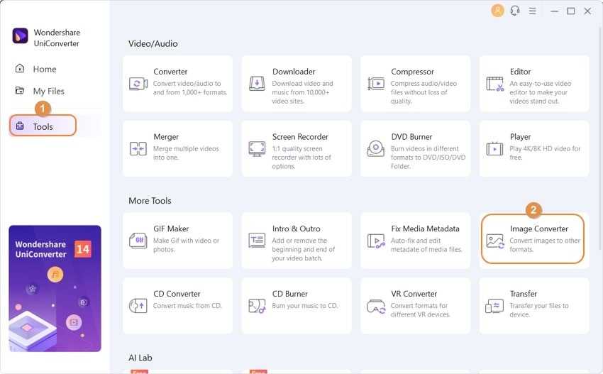 Установите и запустите Wondershare UniConverter, а затем щелкните Панель инструментов. После этого коснитесь Конвертер изображений.