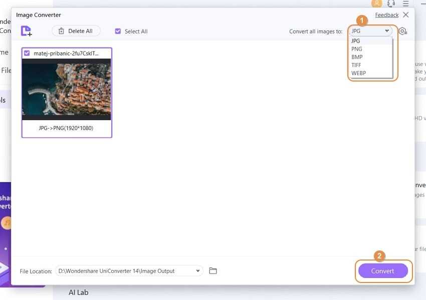 Нажмите Преобразовать все изображения в и выберите целевой формат. Наконец, нажмите кнопку Преобразовать.