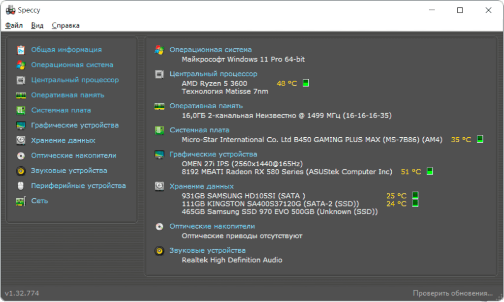 От разработчика Piriform Software программа Speccy. В разделе Общая информация отображается Центральный процессор, Оперативная память, Системная плата и не только. Нужно больше? Выберите точный подраздел. В настройках можно выбрать русский интерфейс.