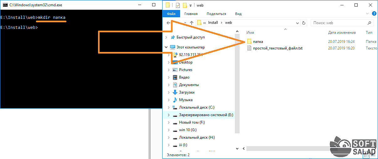 Создание папки — mkdir папка. Папка также создается в текущем местоположении.