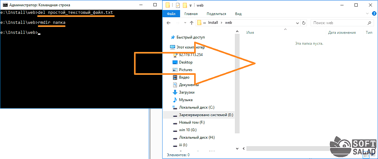 - Удаление файла (или нескольких) — del простой_текстовый_файл.txt (если требуется удалить несколько файлов, просто вписываем их имена друг за другом через пробел). Удаляем созданный ранее файл.