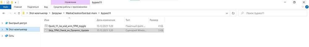 Если по какой-то причине этот способ не сработал, можно отключить проверку совместимости вручную. Для начала запустить скрипт, дважды кликнув по файлу Skip_TPM_Check_on_Dynamic_Update, который расположен в папке bypass11 распакованного архива.