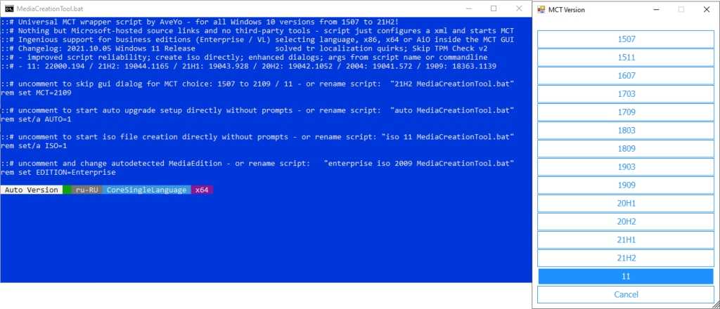 - Возможно, на экране отобразится предупреждение от Defender – потребуется нажать на «Подробнее» и выполнить операцию в любом случае. После появится командное окно с меню, где указан список с различными версиями, которые можно скачать с помощью Media Creation Tool. Наш вариант – версия «11».