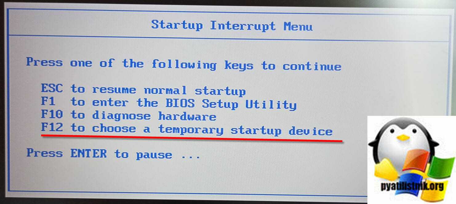 а затем вы попадете в «Startup Interrupt Menu», где за выбор устройства с которого будет идти загрузка, отвечает пункт «F12 to choose a temporary startup device». Значит просто нажимаем клавишу F12.