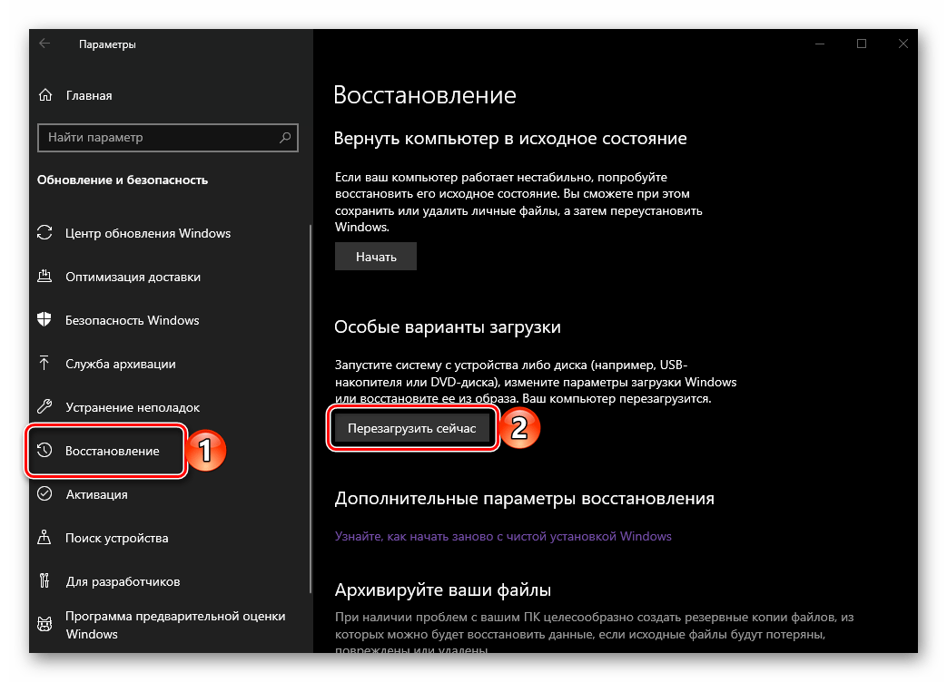 Способ 2: Особые варианты загрузки ОС Перейти к восстановлению Виндовс 10 можно и немного иначе, обратившись к ее «Параметрам». Отметим, что данный вариант подразумевает перезагрузку системы.