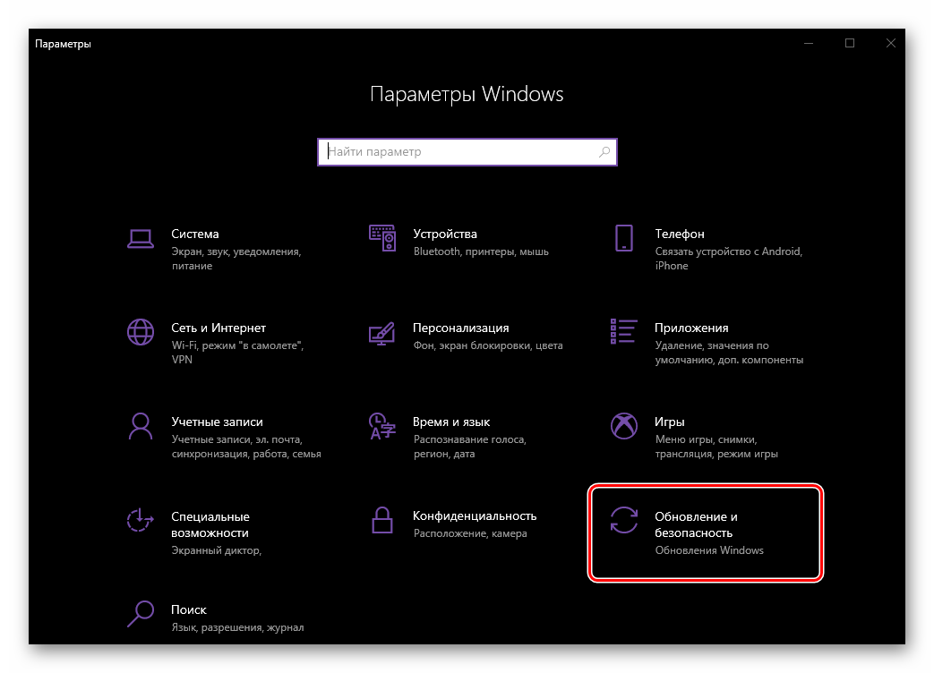 - Нажмите «WIN+I» для запуска окна «Параметры», в котором перейдите к разделу «Обновление и безопасность».