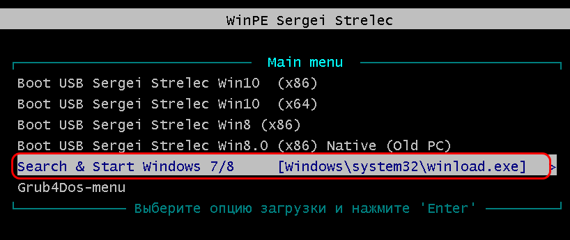 В части переразметки диска работе с командной строкой есть удобная, юзабильная и более безопасная альтернатива – мегафункциональный менеджер дисков DiskGenius. Он умеет создавать специфические разделы типа EFI-загрузчика в пару кликов и, соответственно, будет как нельзя кстати, если в пересоздании загрузочного раздела станет необходимость. Программа DiskGenius входит в состав известного реанимационного LiveDisk’а by Sergei Strelec, его и будем использовать для выполнения поставленных темой статьи задачи. Преимуществом именно этого «живого диска» в части решения проблем с загрузкой Windows является возможность запуска системы без загрузчика в принципе. Одним из пунктов меню запуска LiveDisk’а Стрельца обнаружим утилиту «Search & Start Windows…»: она выполняет роль загрузчика Windows 7, 8.1 и 10 и может запускать систему при условии, что файлы её самой целы и невредимы. Если при восстановлении загрузчика возникнут сложности, эта утилита станет временным решением для запуска операционной системы.