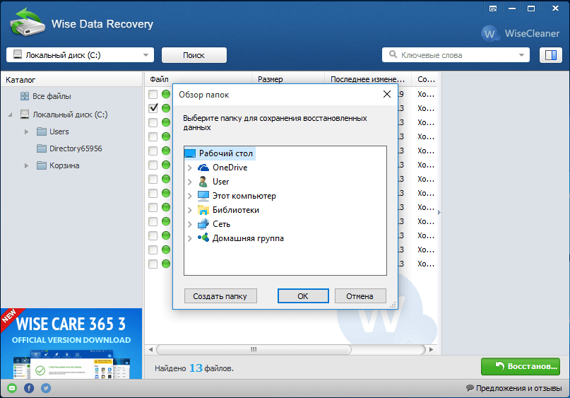 Из списка файлов видно, что Wise Data Recovery удалось найти все файлы, которые находились в удаляемой папке. Теперь выберем необходимый файл и нажмем кнопку Восстановить…. После этого появится окно, в котором необходимо указать место сохранения файла и нажать OK.