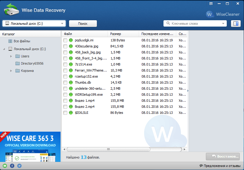С помощью программы Wise Data Recovery можно восстанавливать файлы разных форматов: документы, архивы, изображения, аудио, видео, файлы электронной почты. Программа имеет простое управление и быстро выполняет действия по восстановлению удаленных файлов.