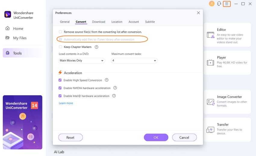 Откройте Wondershare UniConverter на своем компьютере. В правом верхнем углу откройте меню Параметры и выберите пунктНастройки. Во всплывающем окне выберите вкладку Конвертировать включите опцию автоматического добавления файлов в библиотеку iTunes после преобразованияи нажмите кнопку OK.