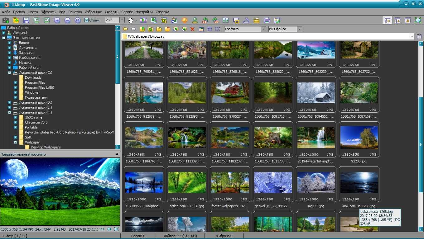 IrfanView — программа для просмотра различных форматов фото, аудио и видео со встроенным графическим редактором. Её можно загрузить и пользоваться абсолютно бесплатно. Поддерживается режимы слайд шоу и полного экрана. А также присутствует предварительный просмотр изображений, по аналогии с лучшими файловыми менеджерами для Windows 10.