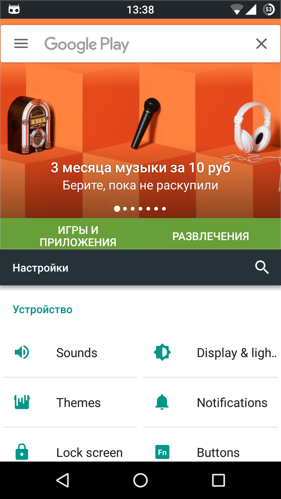 Play Маркет и «Настройки» на одном экране