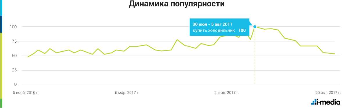 Рис. 12. История показов по фразе «Холодильник купить», Яндекс.Вордстат, ноябрь 2016–октябрь 2017