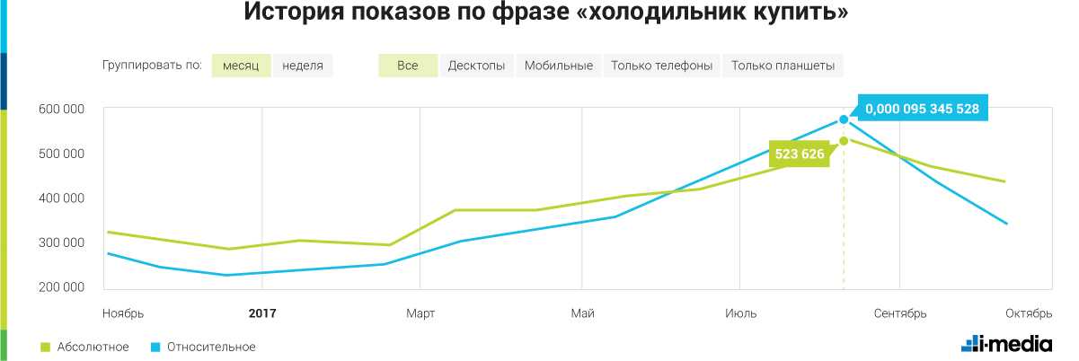 Пришло время переключить наше внимание на бытовую технику. Обратимся к истории показов по запросу «холодильник купить» в Яндекс.Вордстате и увидим довольно любопытную картину
