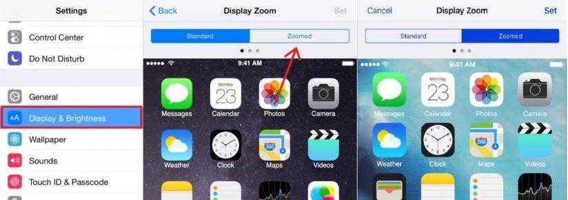1. Перейти в «Настройки» и выбрать «Дисплей и Яркость».2. После, нажмите «Увеличение дисплея» и выберите опцию просмотра, чтобы проверить, включено или отключено увеличение дисплея.3. Если опция находится в состоянии масштабирования, просто выберите стандартный режим, после чего нажмите на кнопку «Применить», чтобы сохранить изменения.4. В следующем окне нажмите кнопку «Использовать стандарт» , чтобы продолжить работу со стандартным режимом.