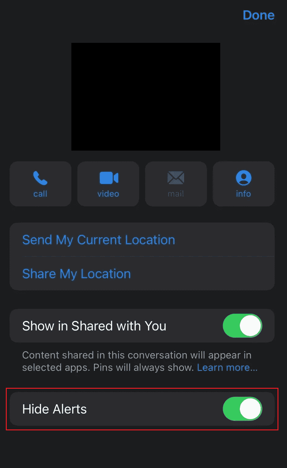 - Второй способ потребует чуть больше манипуляций. Открыв диалог, нужно нажать на имя абонента, тогда выплывет меню контакта. Нажать на значок «i» («Информация») и перевести тумблер в пункте «Скрыть оповещения» влево и таким образом выключить его.