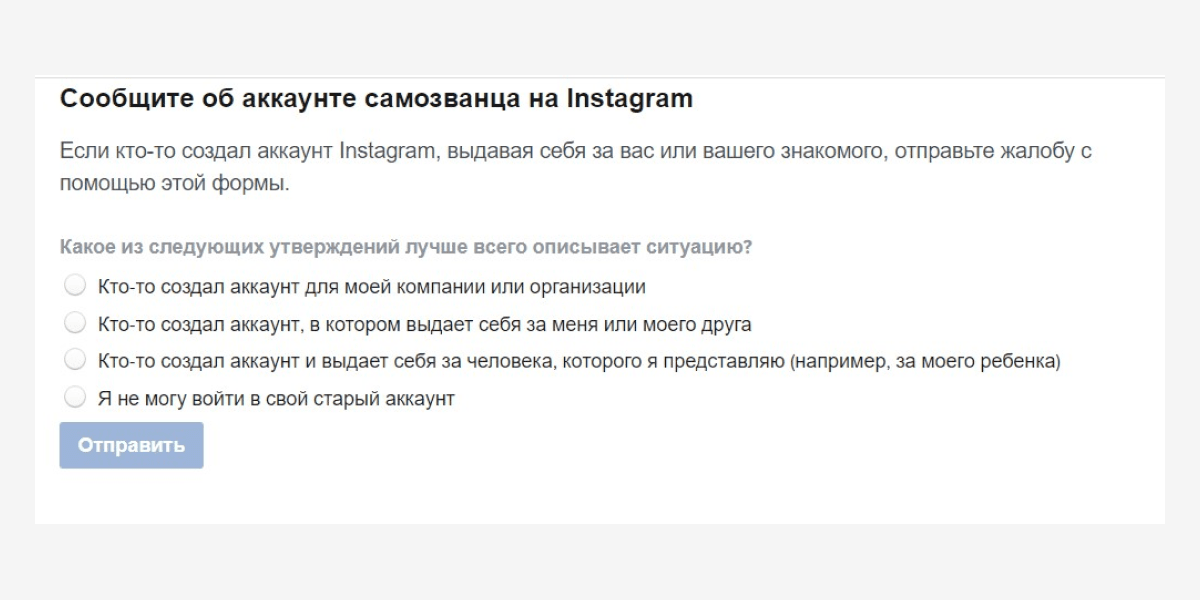 Кстати, в процессе подготовки статьи выявились и некоторые нестыковки. Например, Инстаграм* сообщает, что подать жалобу может только тот человек, за которого самозванец себя выдает, но в форме, как видите, есть пункт «Кто-то выдает себя за моего знакомого».