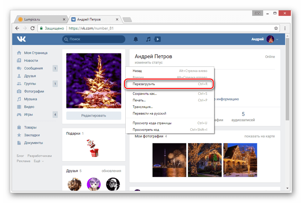 - Находясь на сайте социальной сети, нажмите левую кнопку мыши и выберите пункт «Перезагрузить».