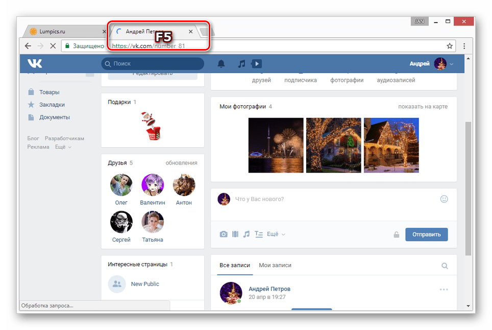 - Предварительно открыв какой-либо раздел сайта ВК, убедитесь, что курсор мыши находится вне текстовых полей. В противном случае страница может не обновиться.
