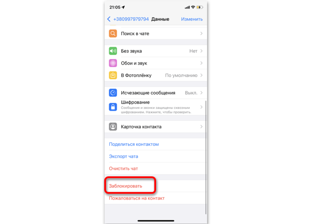 - Блокировка контакта в приложении.