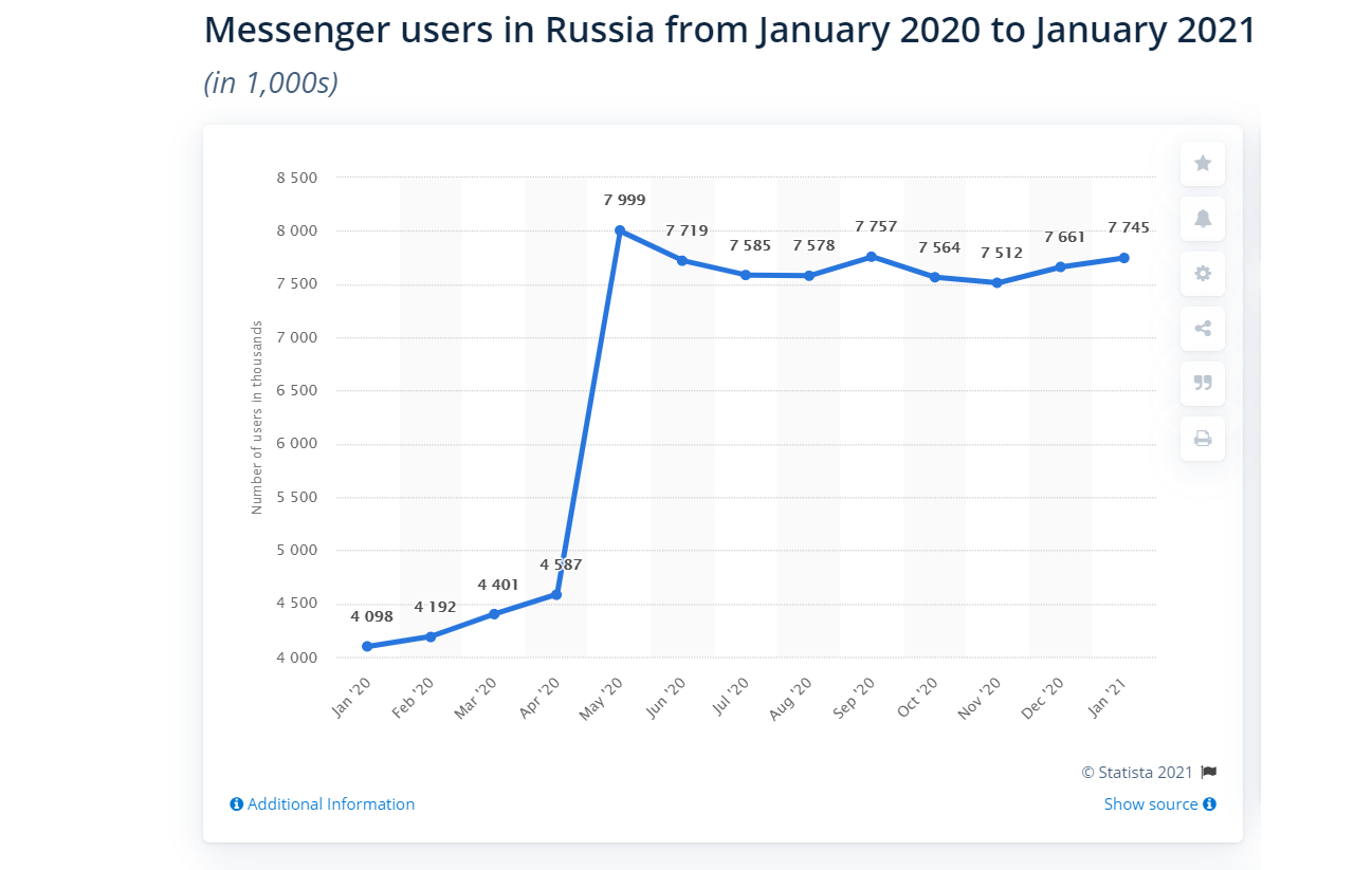 При этом, согласно исследованию The State of Social, в 2018 году мессенджеры для общения с клиентами использовали только 20 % компаний. Сейчас этот показатель вырос, но канал коммуникации освоили далеко не все, поэтому еще можно успеть войти в этот тренд. К тому же, как выяснили в компании Statista, в 2020 году количество пользователей мессенджеров в России увеличилось в 2 раза.