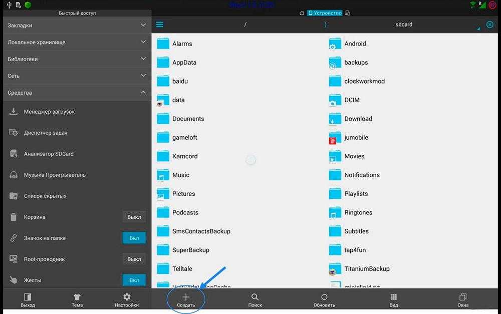 Итак, переходим в нужное место, в которое вы хотите добавить папку на планшете. Например, вам необходимо создать в корневом меню ещё одну папку с названием «Видеофайлы». В этом случае вам нужно нажать на кнопочку «+Создать». Откроется окно с предложением назвать вашу новую ячейку. Заполняете это поле и жмёте “ОК”. Готово! У вас получилось «изготовить» дополнительный отсек на флешке и дать ему имя. Теперь можете добавлять в него файлы и другое содержимое.