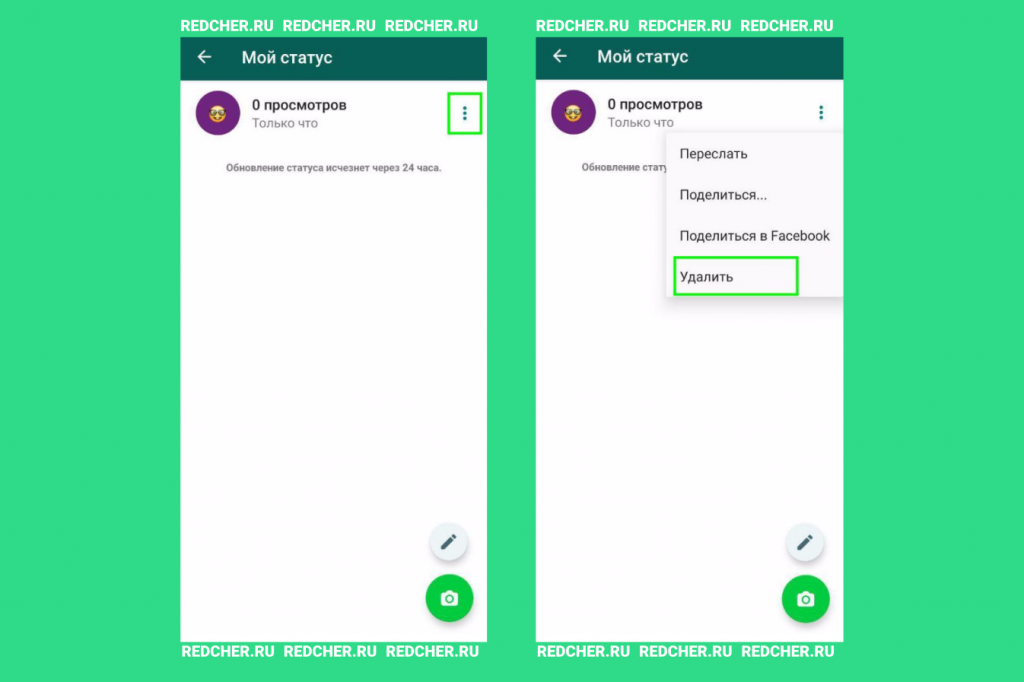 Для того, чтобы убрать опубликованный статус для WhatsApp, Вам необходимо находиться во вкладке «Статусы». Как туда попасть, мы уже объясняли в одном из предыдущих разделов этой статьи. После этого, нажмите на горизонтальное троеточие возле картинки или текста, которую опубликовали ранее, но теперь хотите избавиться.