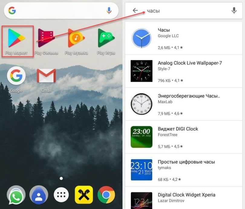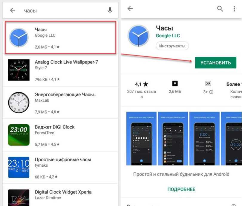Шаг 1. Запустите Play Маркет и в строке поиска наберите «Часы». В списке найдите и выберите приложение от компании Google LLC. Это официальный инструмент для Андроид, но вы можете использовать любое другое.