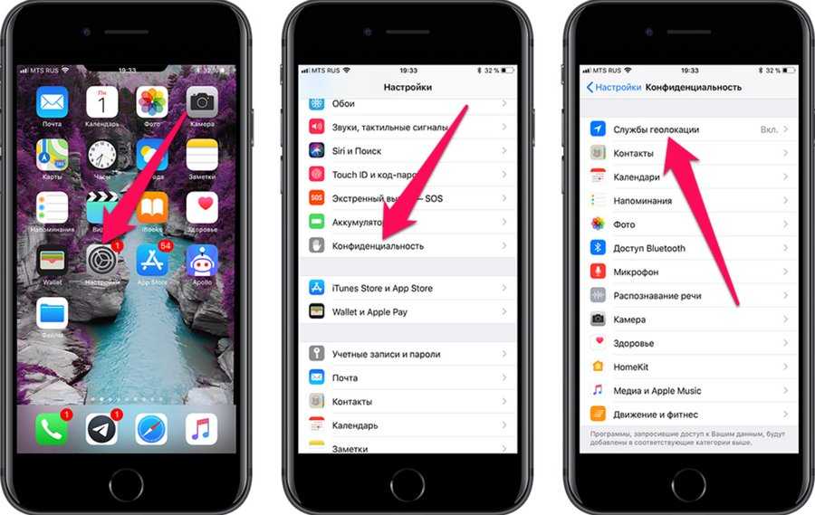 На устройствах компании Apple для включения определения местонахождения необходимо перейти в раздел «Конфиденциальность», далее – в «Службы геолокации». Там нужно поставить переключатель в положение «Вкл».