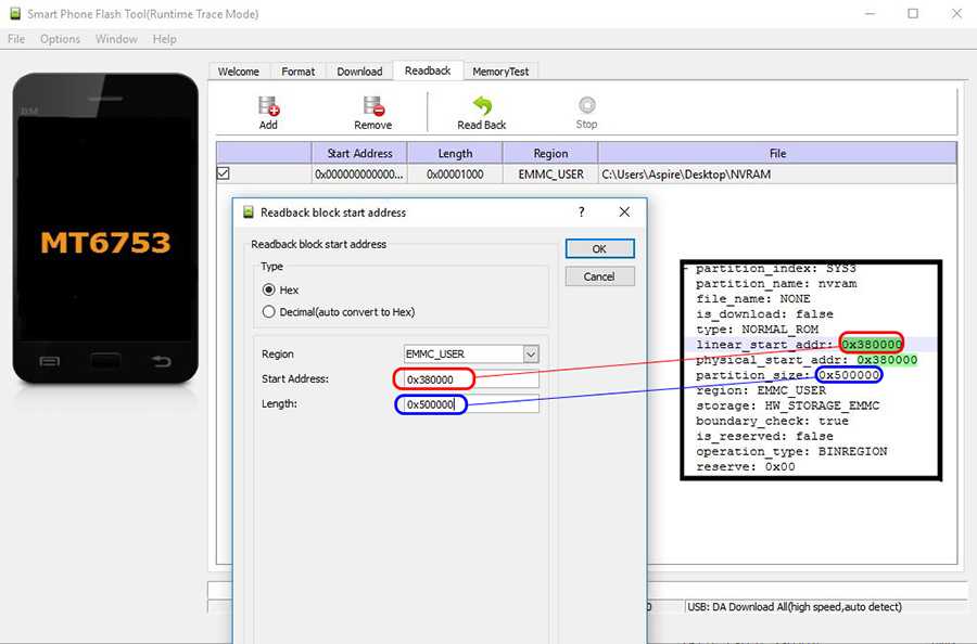 - Скопируйте значения linear_start_addr и partition_size в SP Flash Tool для начального адреса и длины соответственно