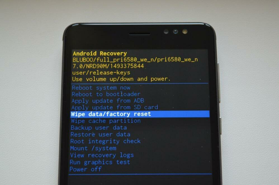 Шаг 2. Из предложенного перечня выберите строку «wipe data/factory reset”, как показано на изображении (стандартно перемещение происходит с помощью качельки громкости вниз/вверх, а для утверждения выбора, кнопка включения).