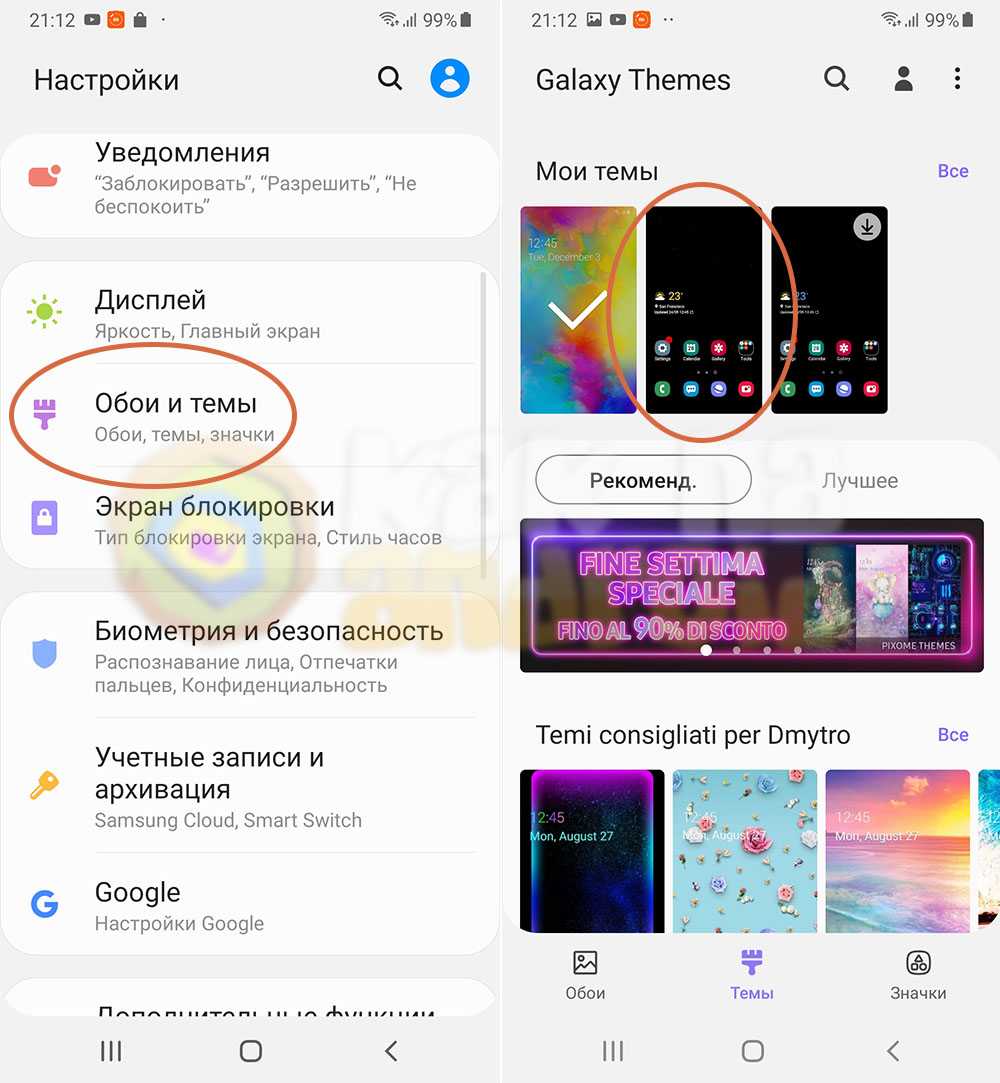 На момент написания статьи, в оболочке OneUI присутствует две фирменные темные темы, поставить которые можно из категории “Обои и темы” настроек смартфона.