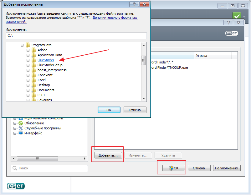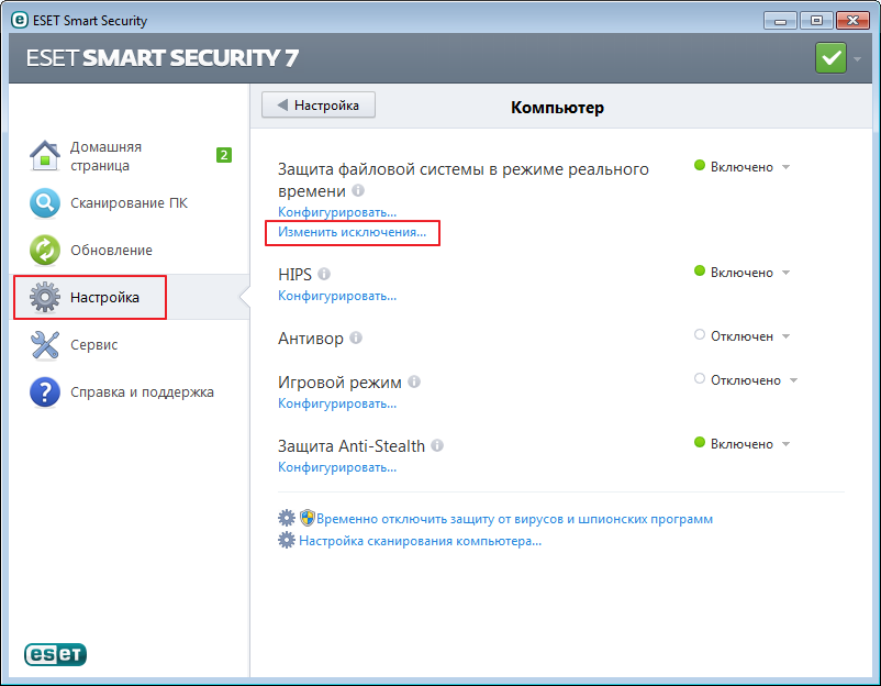 Довольно часто установленный на компьютере антивирус, в целях безопасности, может блокировать некоторые приложения или выход в интернет. Поэтому заходим в свою защиту, у меня это Eset Smart Security, и добавляем BlueStacks в список исключений. В моем антивирусе я захожу в «Настройки-Изменить исключения».