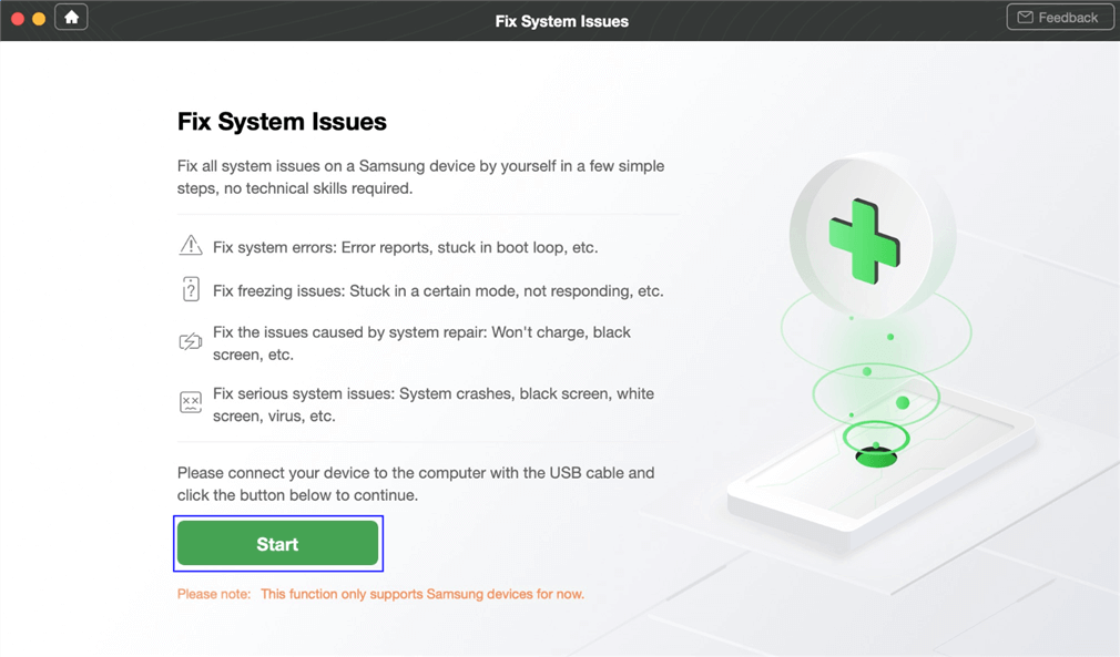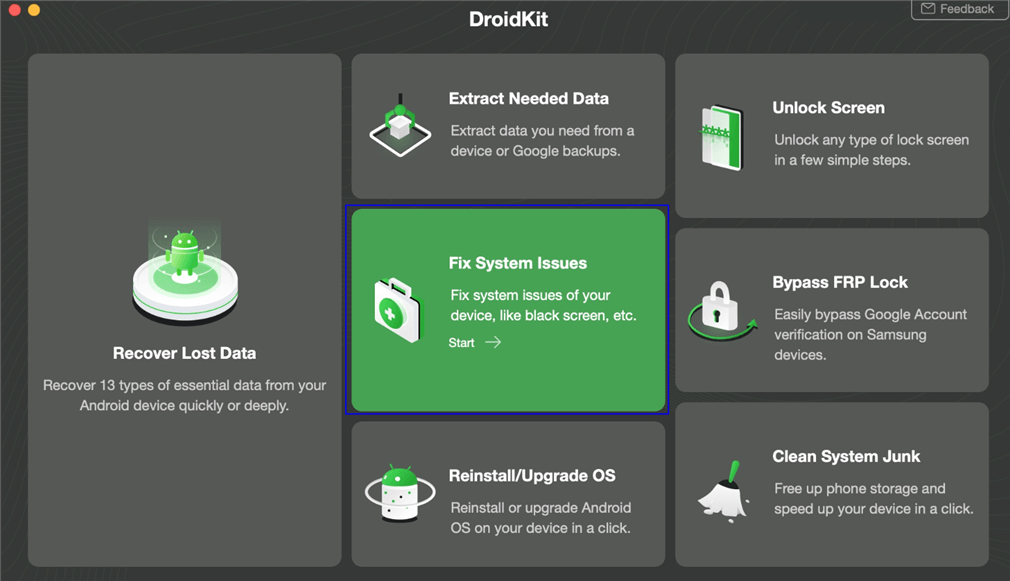 If you fail to reboot to Bootloader Samsung, you may encounter an Android system issue. In this case, you need to turn to some special Android system recovery instrument to get your Android phone repaired. Among many Android system recovery tools in the market, you can give DroidKit – Android Repair Tool a shot! Its specially designed “Fix System Issues” mode helps you to get rid of most Android system issues involving stuck in the recovery mode, touch screen not working, phone screen frozen, etc.