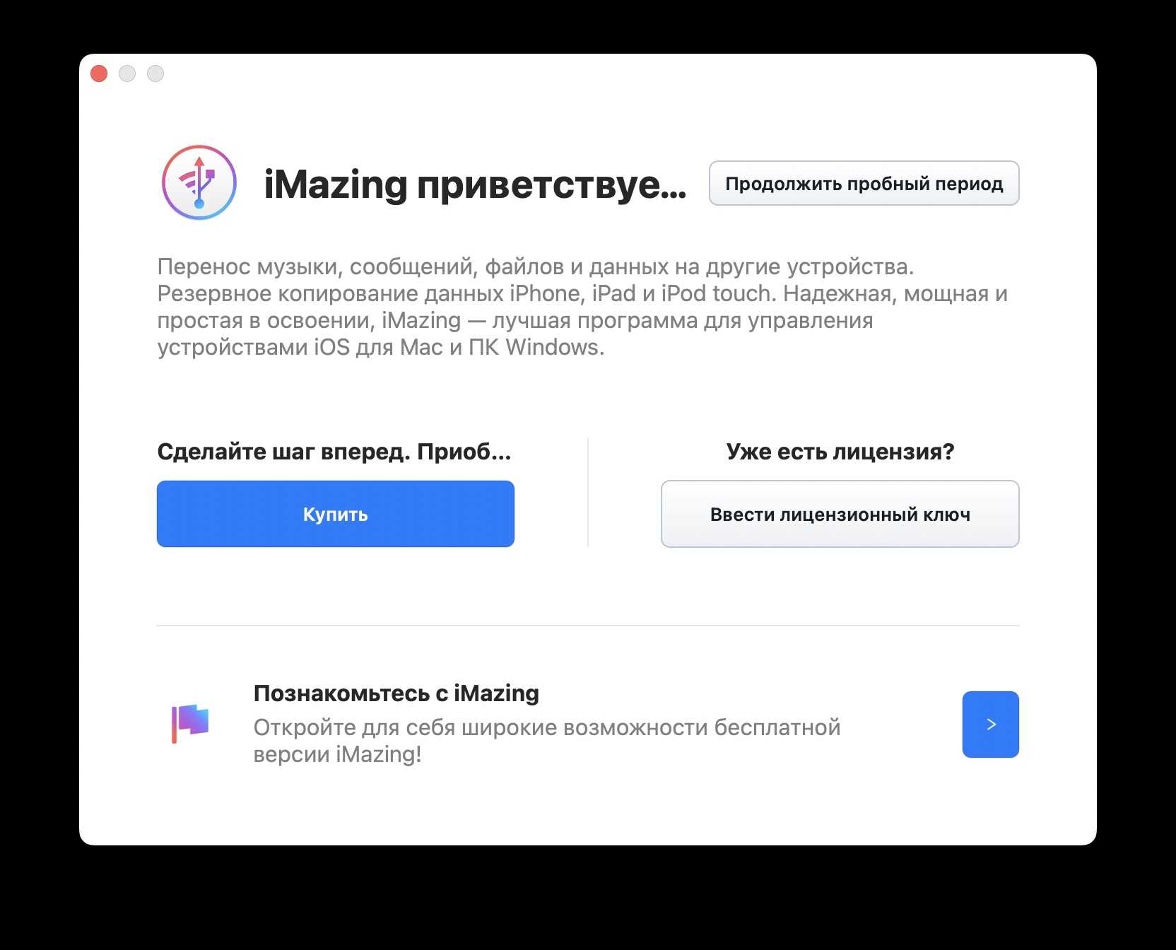 После установки программа предложит приобрести платную версию. Покупать не обязательно, хотя дополнительных возможностей много. Но главное, что и без покупок необходимая для переноса приложений функция работает. Так что запускаем пробную версию.