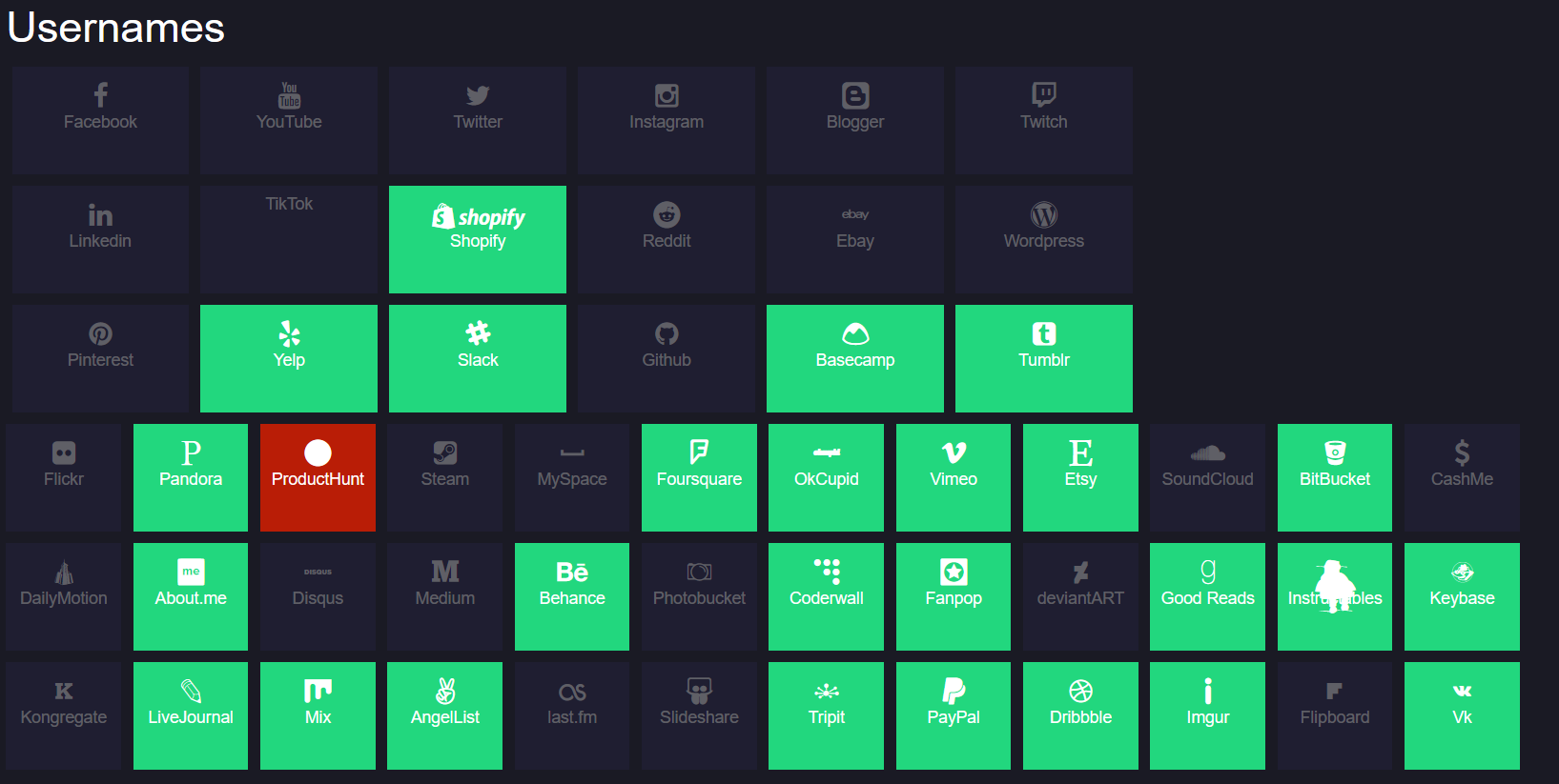 Логотипы сайтов, помеченные зеленым цветом, означают то, что имя свободно на данном интернет-ресурсе. Если сайт выделен красным цветом – это означает, что произошла ошибка поиска. Но если логотип сайта не выделен никаким цветом – это свидетельствует о том, что в данной социальной сети есть пользователь с разыскиваемым ником