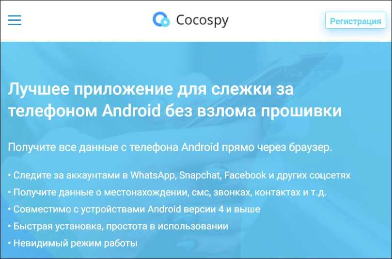 Инструмент шпионажа Cocospy «заточен» только под мобильные устройства Android и iOS. По набору возможностей он практически идентичен продуктам конкурентов, однако у него есть существенный плюс – полностью русифицированные личный кабинет пользователя, инструкции по установке и настройке, FAQ и другие материалы сайта.