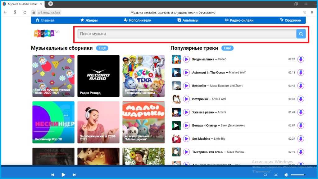 Функционалом ресурса предусмотрена возможность найти песню по исполнителю или словам из её названия. Для этого на главной его странице следует нажать на пункт “Артисты” в колонке справа. Отобразится уже знакомая нам поисковая строка, в которой и нужно написать ваш запрос, чтобы найти музыку.
