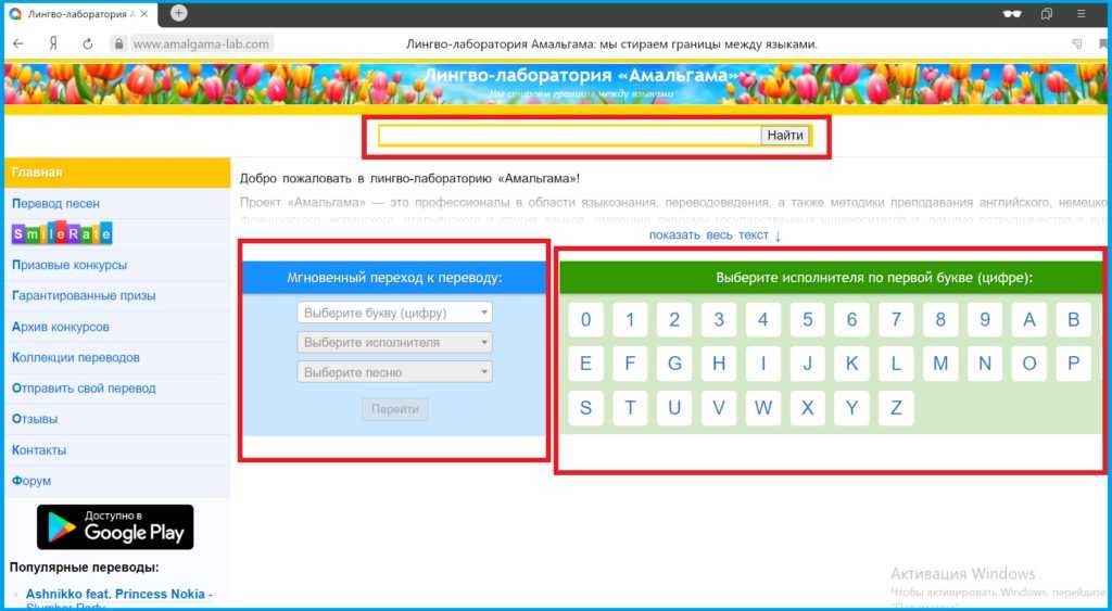 Amalgama-lab —портал, на котором специалисты лингвисты переводят песни со всех зарубежных языков на русский. Отметим сразу, для поиска отечественных песен данный сервис не подойдёт… К тому же, если вы не знаете исполнителя композиции — использование сайта бессмысленно, ведь если попробовать найти песню, которая понравилась без указания автора — ничего не получится.