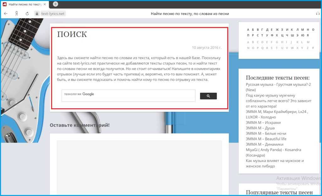 Если получилось уловить не только мотив, но и слова музыкальной композиции, то для поиска можно воспользоваться простым и удобным сервисом, который поможет найти нужный трек при введении строки из песни в соответствующее поле.