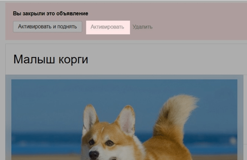 Такой же цели можно добиться, перейдя на страницу объявления. Это выполняется с помощью кнопки «Редактировать, закрыть, применить услугу». Ее расположили над изображением, которое мы прикрепили к объявлению.