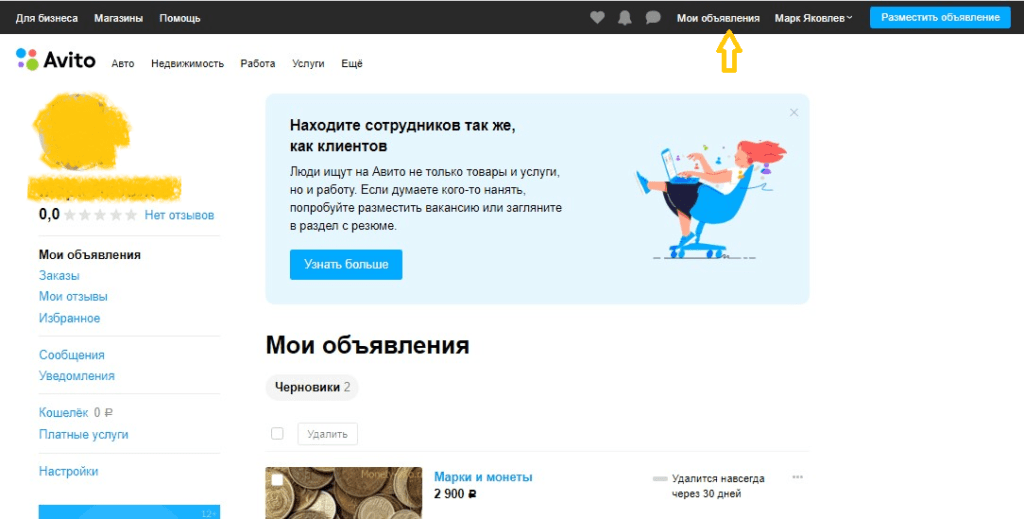 В личном кабинете пользователя отражаются все составленные им объявления, а также их состояния. Открыть их полный список можно, нажав на кнопку Мои объявления на сайте Avito, расположенную на верхней панели.
