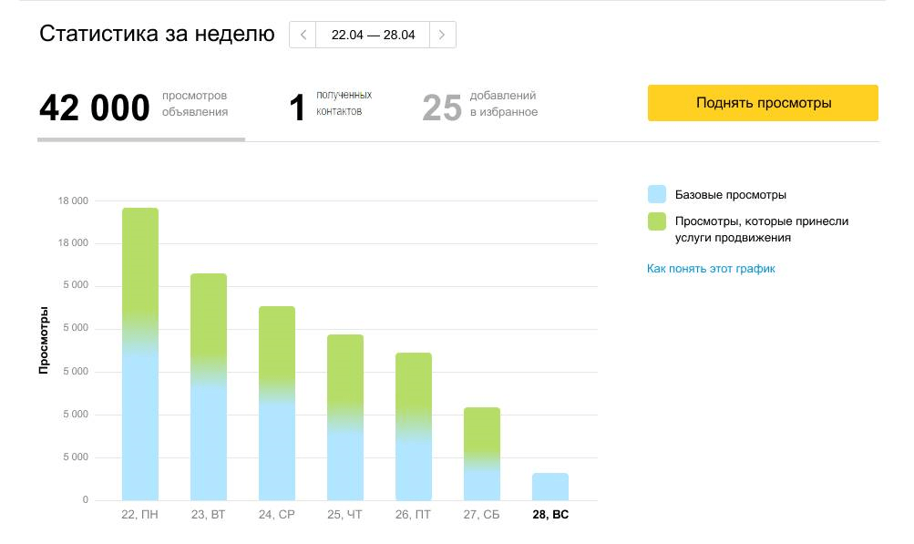 Через вкладку “Объявления”. Тут собираются детальные отчеты и информация по каждому конкретному объявлению. Во-первых, можно увидеть основную информацию о длительности размещения объявления, количестве просмотров, подключенных услугах продвижения, конверсии. Последняя определяется как процентное отношение контактов к просмотрам. Контакты — это сколько раз потенциальные покупатели нажали кнопку “Показать номер” и написали в чат. Во-вторых, данные можно увидеть в динамике, проследить изменение активности потенциальных клиентов. Например, отследить дни повышенного спроса, проанализировать изменение конверсии в дни, когда применялись рекламные услуги.