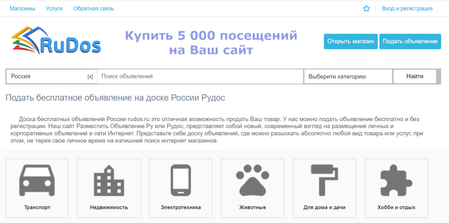 Сайт Рудос – является одним из крупнейших ресурсов с российскими объявлениями, начал свою деятельность в 2013 году, пользующийся популярностью у обширной целевой аудитории, занимает заслужено высокое место в рейтинге самых лучших и популярных досок в России и СНГ.