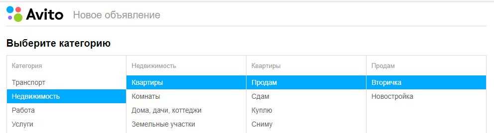Выбираем раздел «Недвижимость» и кликаем на подкатегории вплоть до последней графы. На примере мы показываем продажу квартиры вторичного рынка.