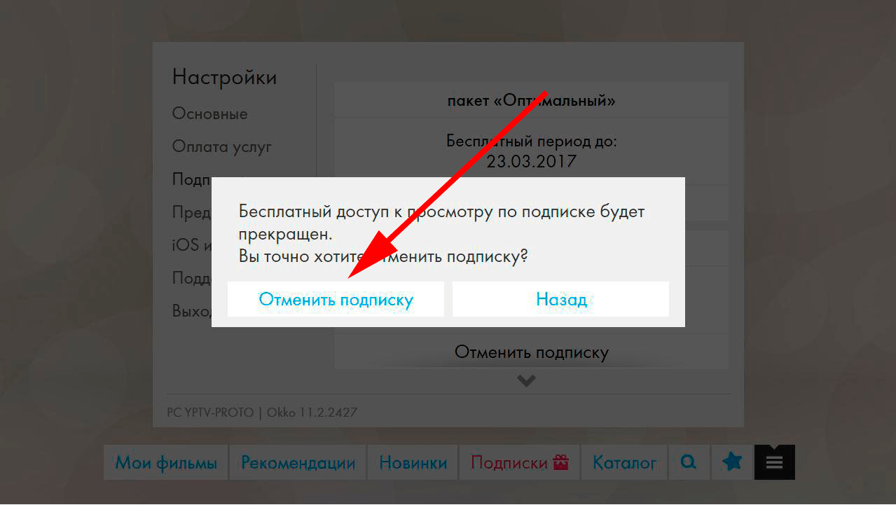 - На экране появится информация о дате окончания подписки, а также способ ее оплаты (банковская карта, сертификат и т.д.). Внизу экрана зритель увидит строку «Отказаться» и должен активировать ее.