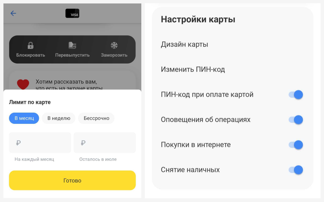В приложении «Тинькофф» в настройках по картам тоже можно установить общий лимит на траты (на месяц, неделю или бессрочно), разрешить или запретить покупки в Интернете, а также снятие наличных.