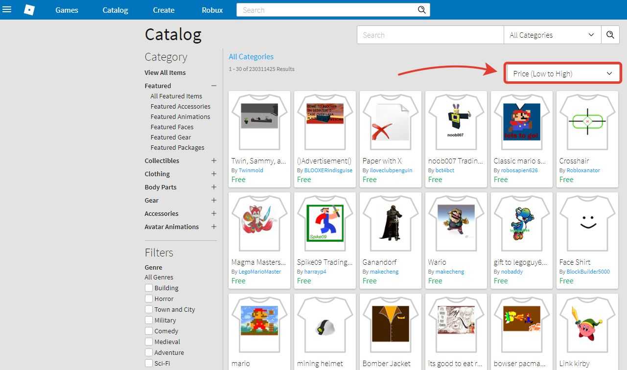- Теперь вы окажетесь в разделе с нарядами. Если у вас есть робуксы, то вы можете приобрести за указанную цену предметы гардероба. Но чтобы получить одежду бесплатно, нам также понадобится фильтр режимов слева. Найдите фильтр «Price» — «Цена» и включите здесь режим «Free» — «Бесплатно«.