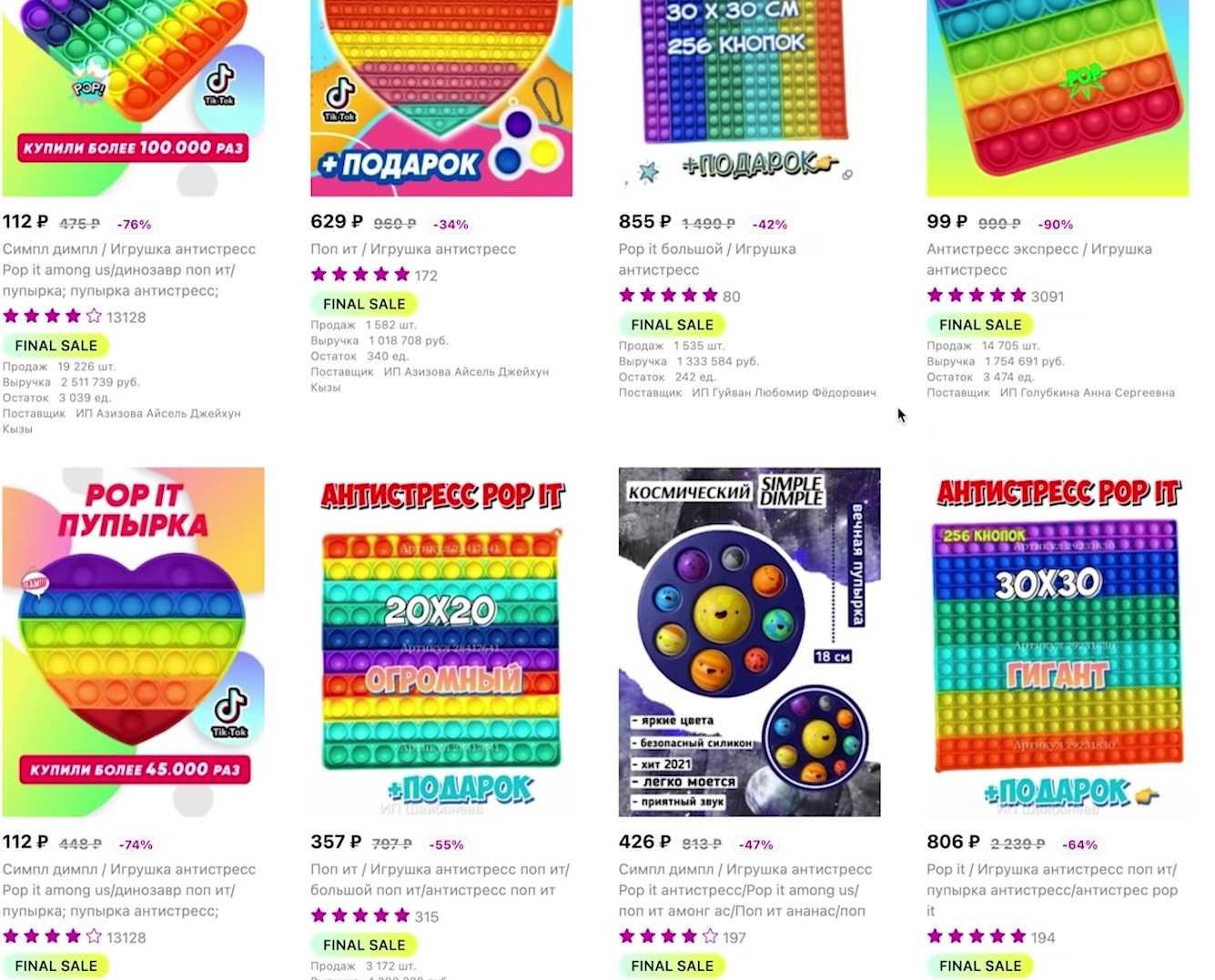 Яркие примеры недавних трендовых товаров (спиннеры, поп-ит) сейчас продаются на Wildberries по скидке до 90%. И, по оценкам Лео Шевченко, по этим позициям продавцы в лучшем случае работают в ноль.