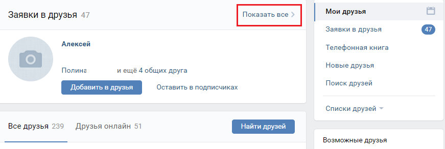 С компьютера нужно щелкнуть мышкой на вкладке «Друзья», которая находится слева от стены. Далее откроется окно, в котором нужно в списке справа выбрать «Запросы на добавление в друзья» и нажать «Показать все»